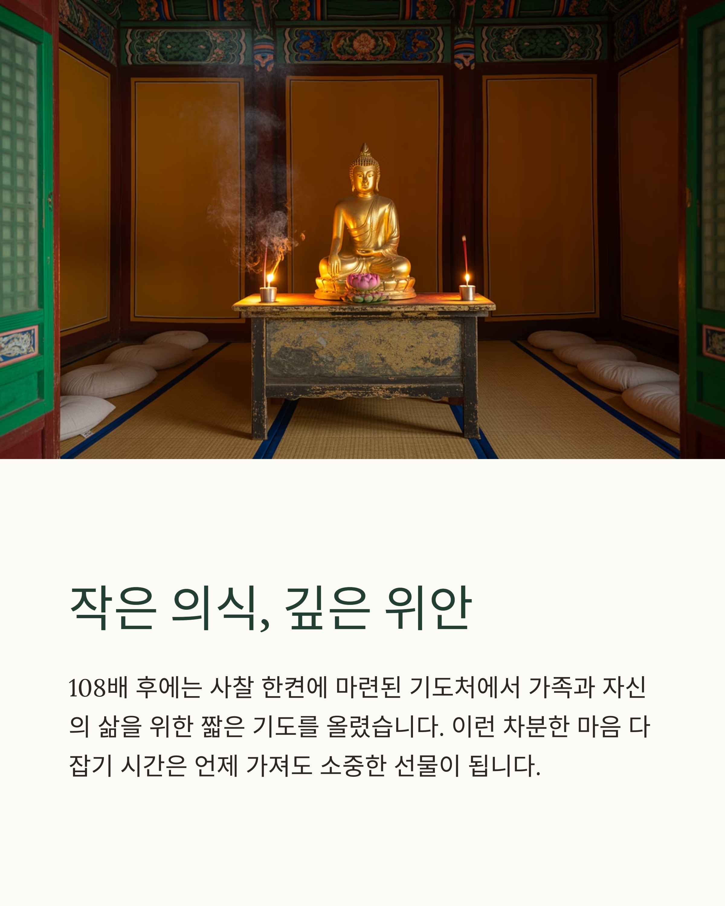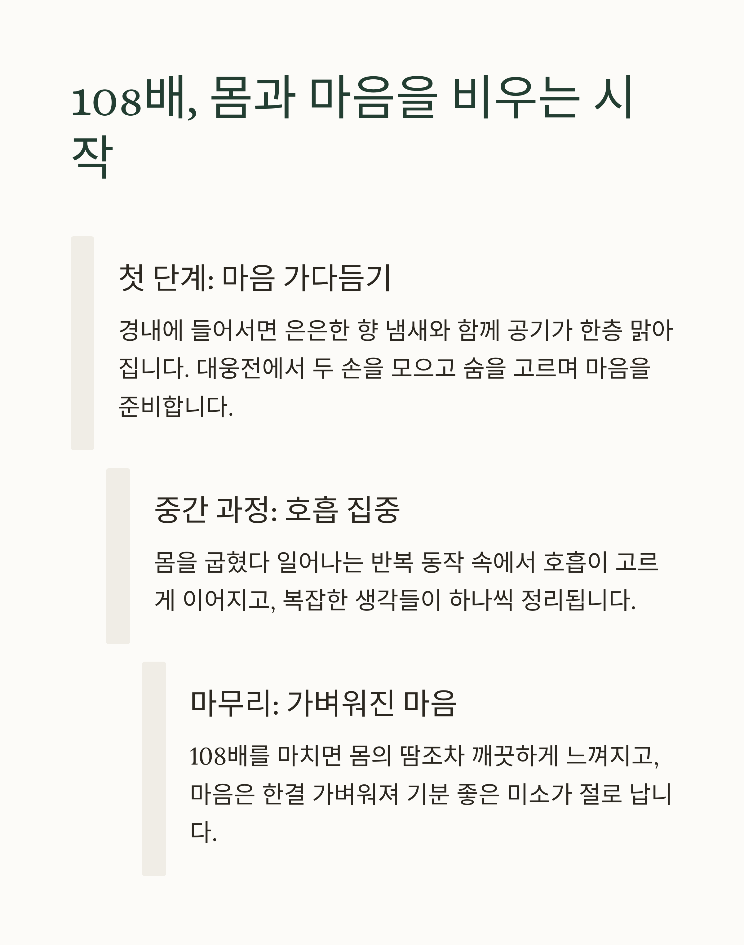 사찰 경내로 들어서니 공기는 한층 더 맑고 서늘했습니다. 향 냄새가 은은히 스며드는 경내를 천천히 걸으며 마음을 가다듬었습니다. 대웅전에 들어가 두 손을 모으고 숨을 고른 뒤 조용히 108배를 시작했습니다. 처음에는 몸이 조금 뻐근했지만, 서서히 호흡이 고르게 이어지면서 오히려 몸이 풀리는 느낌이 들었습니다. 마치 내 마음속에 켜켜이 쌓여 있던 복잡한 생각들이 하나씩 정리되는 기분이었습니다.