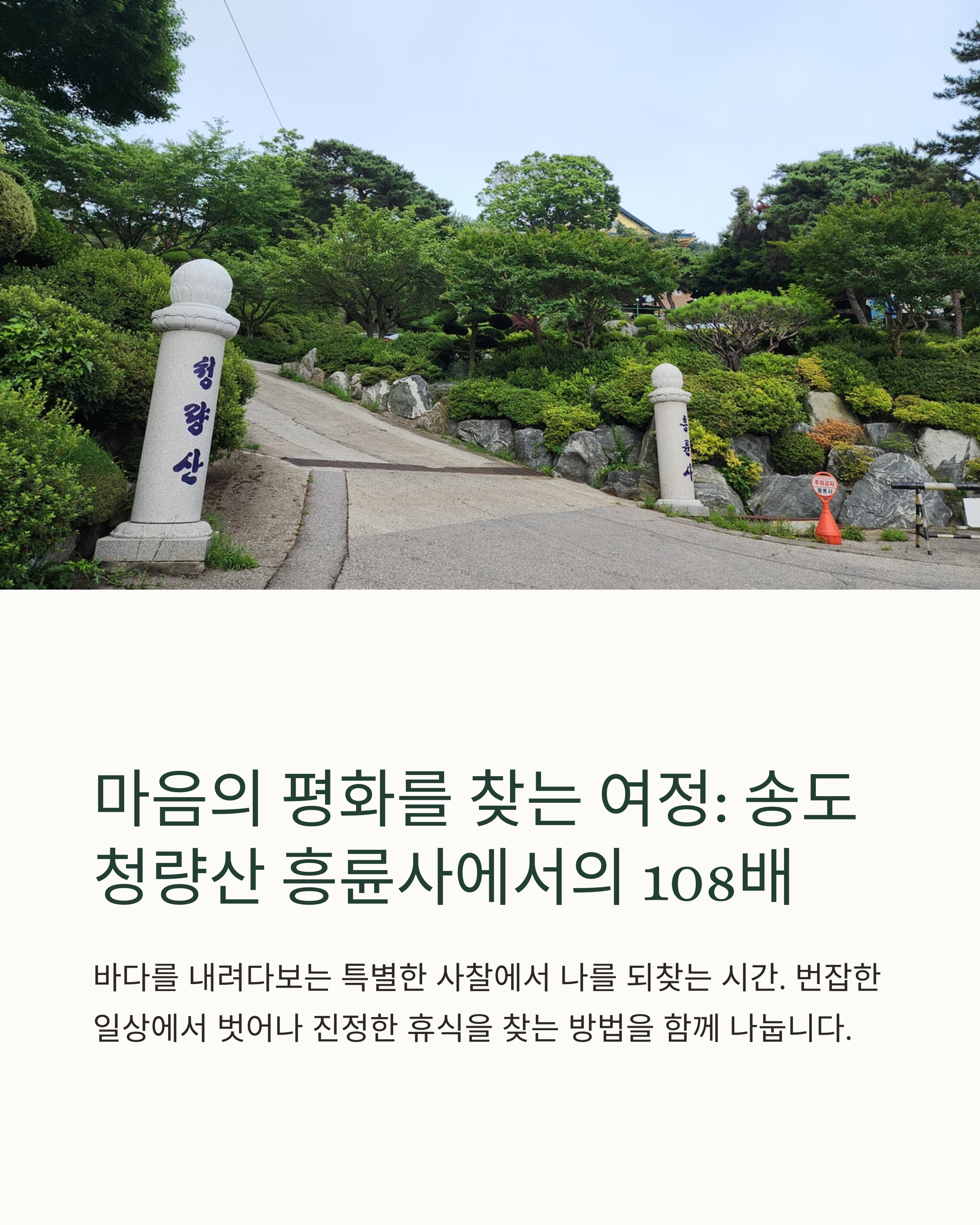 인천 송도의 청량산 흥륜사는 바다를 내려다볼 수 있는 특별한 사찰입니다. 이번 주말, 저는 마음을 비우고 몸도 가볍게 하고 싶어 이곳을 찾았습니다. 송도 바다와 인천대교가 한눈에 들어오는 풍경만으로도 이미 충분히 힐링이 되었는데, 저는 더 깊은 마음의 평화를 얻고자 108배를 결심했습니다.