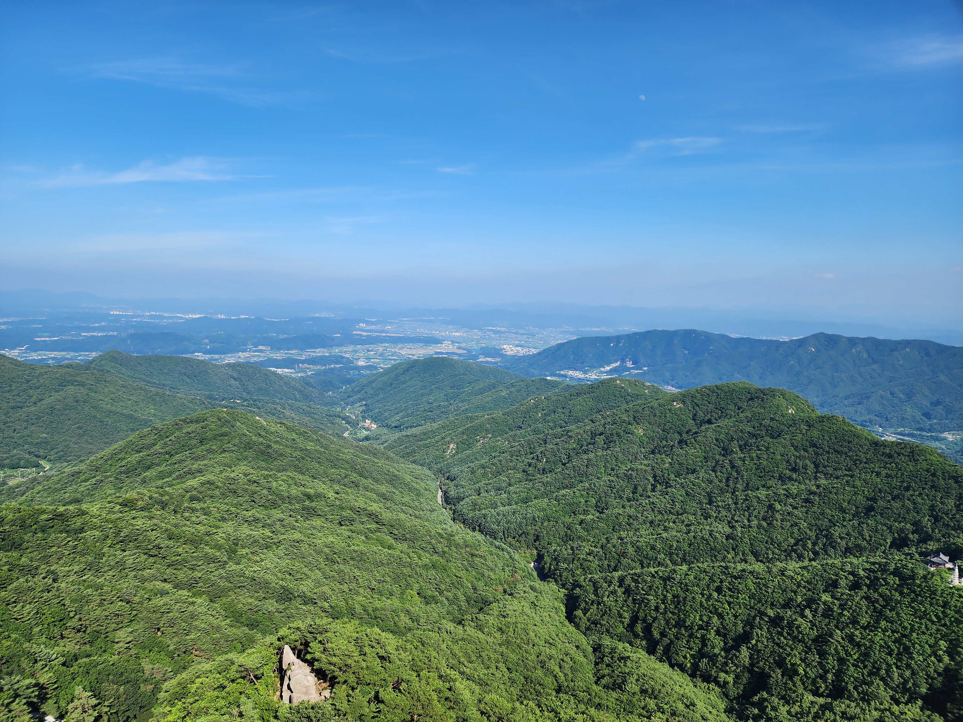 방금 전까지만 해도 온몸이 끈적이고 숨이 차올랐는데, 정상에 올라서자 어디선가 불어오는 시원한 바람이 땀에 젖은 몸을 부드럽게 감싸주었습니다.