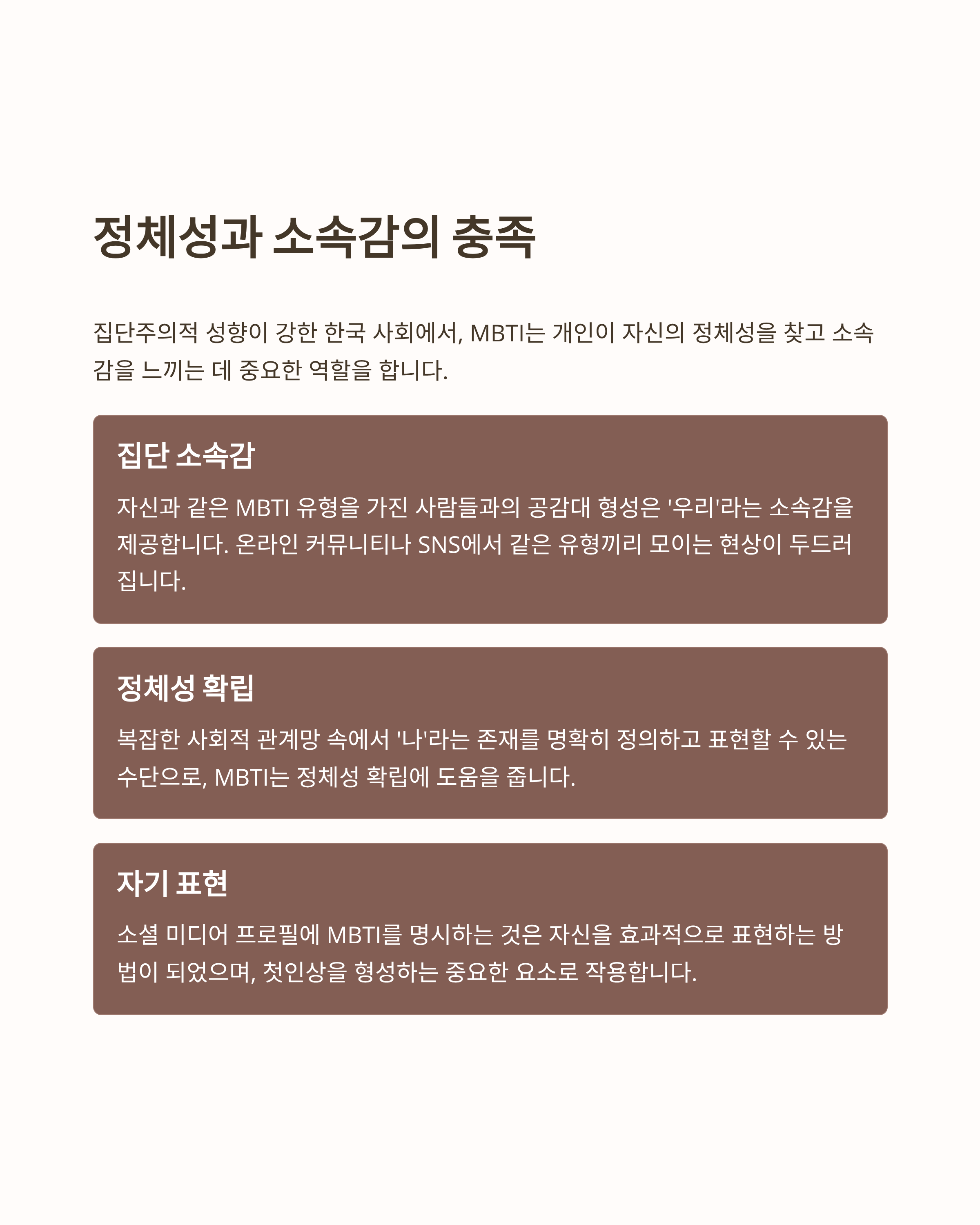 집단주의적 성향이 강한 한국 사회에서 개인은 종종 소속 집단 안에서의 역할과 정체성을 찾으려는 경향이 있습니다. MBTI는 이러한 맥락에서 자신이 어떤 집단에 속하는지, 혹은 어떤 특성을 가진 사람인지를 빠르게 정의하고 표현할 수 있는 수단이 됩니다. ‘나’라는 개인의 특성을 파악하면서도, 동시에 자신과 비슷한 유형의 사람들과 공감대를 형성하거나 다른 유형의 사람들을 이해하는 과정을 통해 사회적 관계망 속에서 자신의 위치와 정체성을 확인하는 데 도움을 받습니다. 이는 한국인들이 중요하게 생각하는 ‘소속감’과 ‘관계 형성’ 욕구와도 연결됩니다.