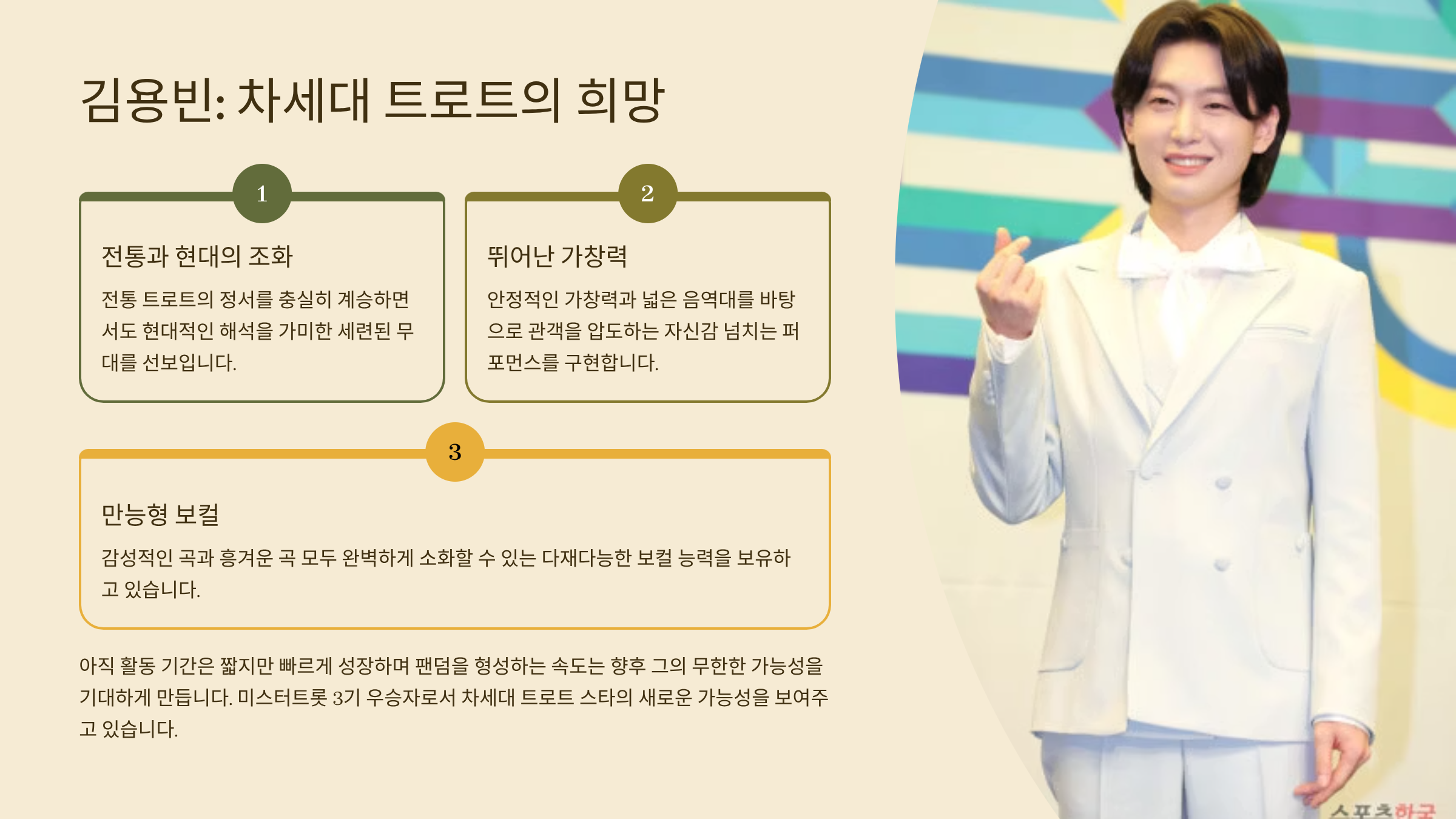 반면 김용빈은 미스터트롯 3기 우승자로서 차세대 트로트 스타의 가능성을 보여주고 있다. 그는 전통 트로트의 정서를 충실히 계승하면서도 현대적인 해석을 가미하여 세련된 무대를 선보인다. 무대에 오르면 안정적인 가창력과 넓은 음역대를 바탕으로 관객을 압도하며, 신인임에도 불구하고 자신감 넘치는 퍼포먼스를 보여준다. 또한 감성적인 곡과 흥겨운 곡 모두 소화할 수 있는 만능형 보컬로서 다양한 무대를 장악할 수 있는 잠재력을 지니고 있다. 아직 활동 기간은 짧지만, 빠르게 성장하며 팬덤을 형성하는 속도는 향후 그의 가능성을 기대하게 만든다.