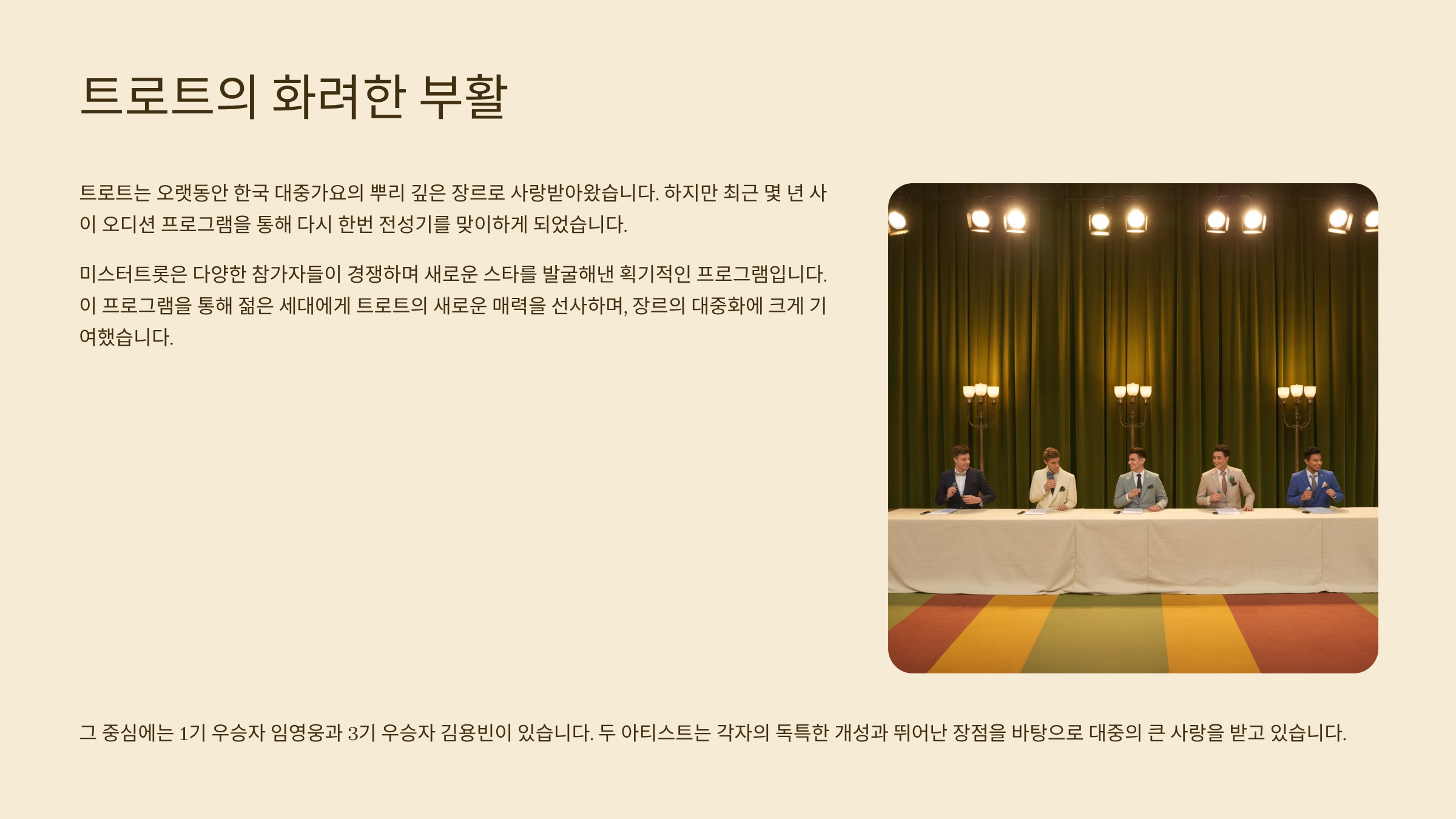 트로트는 오랫동안 한국 대중가요의 뿌리 깊은 장르로 사랑받아왔다. 하지만 최근 몇 년 사이 오디션 프로그램을 통해 다시 한번 전성기를 맞이하게 되었는데, 그 중심에는 미스터트롯이 있다. 미스터트롯은 다양한 참가자들이 경쟁하며 새로운 스타를 발굴해낸 프로그램이다. 그중에서도 1기 우승자 임영웅과 3기 우승자 김용빈은 각자의 개성과 장점을 바탕으로 대중의 큰 사랑을 받고 있다. 이번 글에서는 두 사람의 특장점을 비교하고, 누가 더 훌륭한 가수인지 심층적으로 살펴본다.