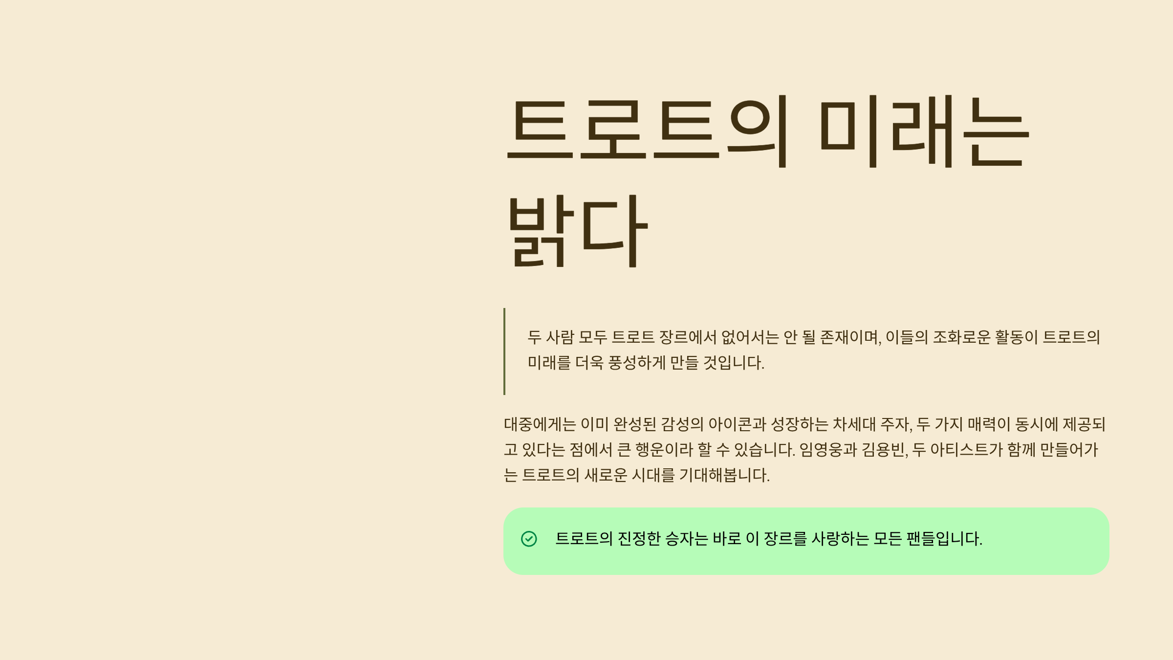 결론적으로 현재의 성취와 대중적 영향력에서는 임영웅이 앞서 있다고 평가할 수 있다. 하지만 김용빈은 앞으로 수많은 무대를 통해 더 큰 성장과 변화를 보여줄 잠재력이 충분하다. 두 사람 모두 트로트 장르에서 없어서는 안 될 존재이며, 이들의 조화로운 활동이 트로트의 미래를 더욱 풍성하게 만들 것이다. 대중에게는 이미 완성된 감성의 아이콘과 성장하는 차세대 주자, 두 가지 매력이 동시에 제공되고 있다는 점에서 큰 행운이라 할 수 있다.