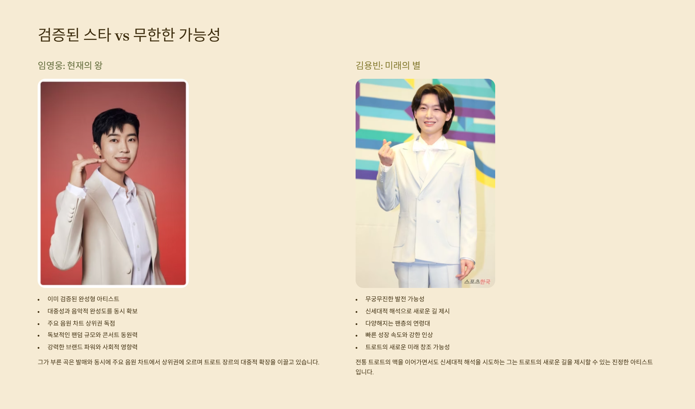 두 사람을 비교했을 때 임영웅은 이미 검증된 스타다. 대중성과 음악적 완성도를 동시에 확보했고, 사회적 영향력 또한 크다. 그가 부른 곡은 발매와 동시에 주요 음원 차트에서 상위권에 오르며 트로트 장르의 대중적 확장을 이끌었다. 팬덤의 규모나 콘서트 동원력, 브랜드 파워 측면에서도 임영웅은 현재 독보적인 위치에 있다. 이는 단순한 가창력 이상의 가치, 즉 스타성과 상징성을 모두 가진 결과라 할 수 있다.