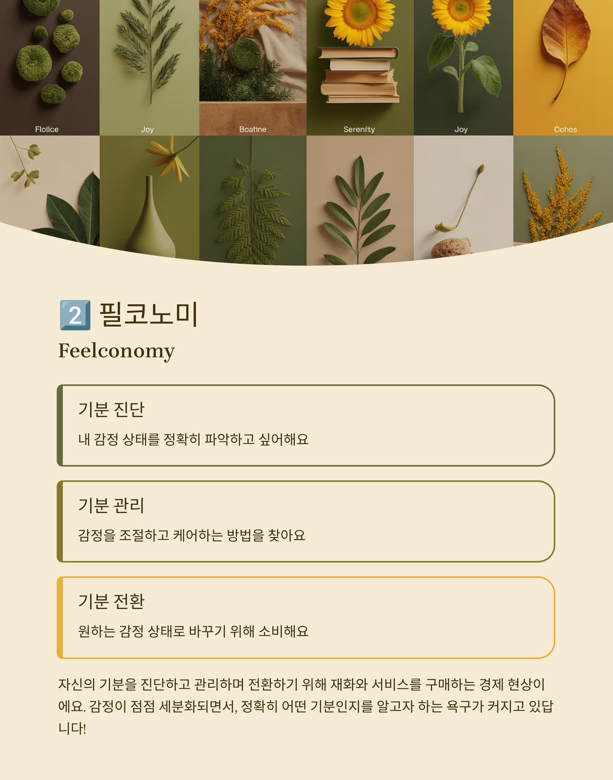 2. 필코노미(Feelconomy) 자신의 기분을 진단하고 관리하며 전환하기 위해 재화와 서비스를 구매하는 경제 현상입니다. 감정이 점점 세분화되며, 정확히 어떤 기분인지를 알고자 하는 욕구가 커지고 있습니다.