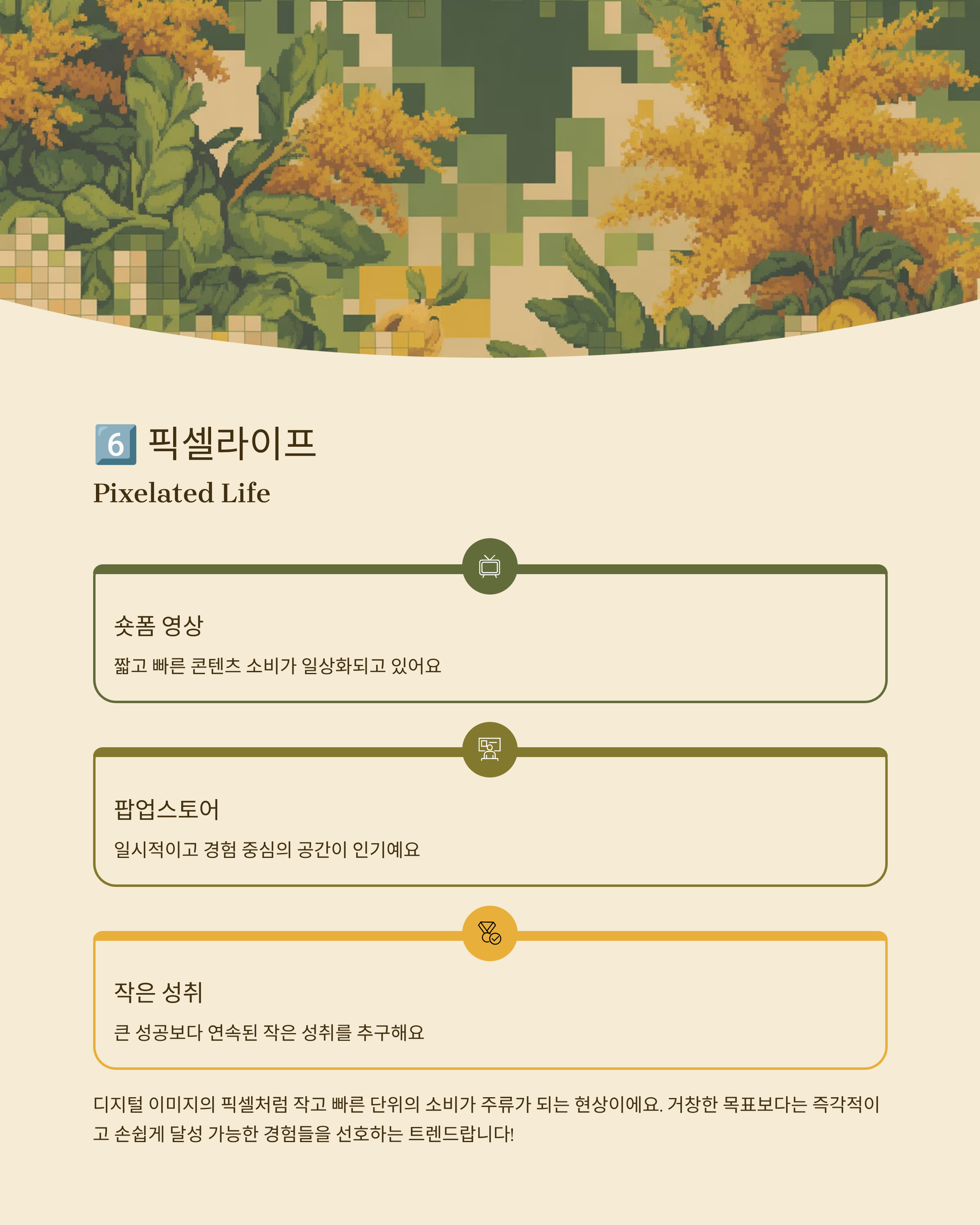 6. 픽셀라이프(Pixelated Life) 디지털 이미지의 픽셀처럼 작고 빠른 단위의 소비가 주류가 되는 현상입니다. 숏폼 영상이나 팝업스토어가 대표 사례이며, 큰 성공보다 작은 성취의 연속이 더 중시됩니다.