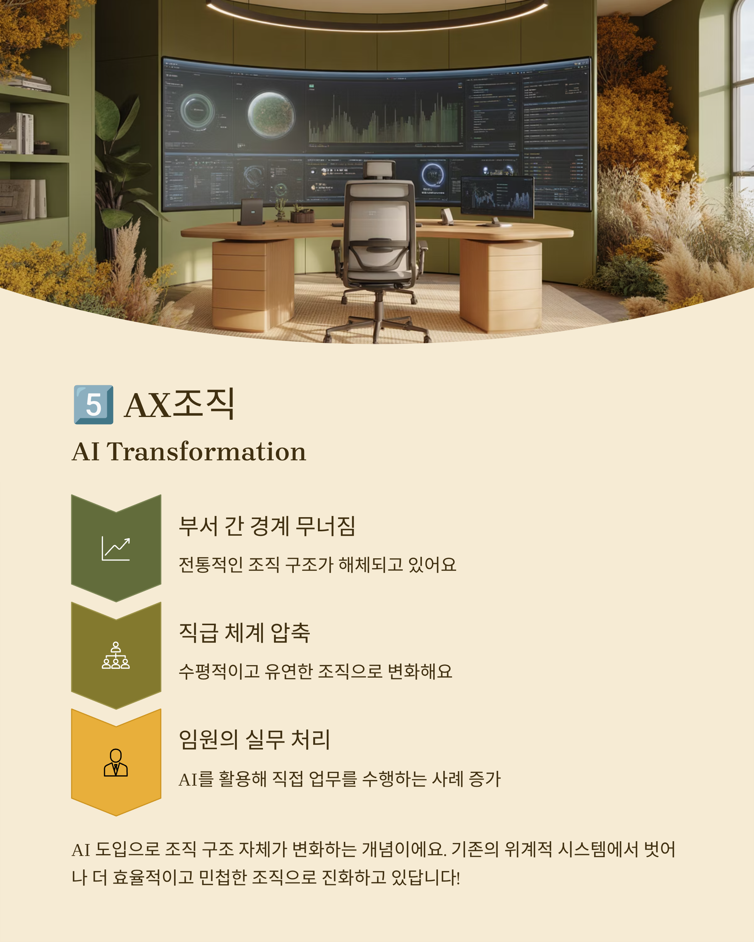 5. AX조직(AI Transformation) AI 도입으로 조직 구조 자체가 변화하는 개념입니다. 부서 간 경계가 무너지고 직급 체계가 압축되면서, 임원들이 AI를 활용해 직접 실무를 처리하는 사례가 늘고 있습니다.