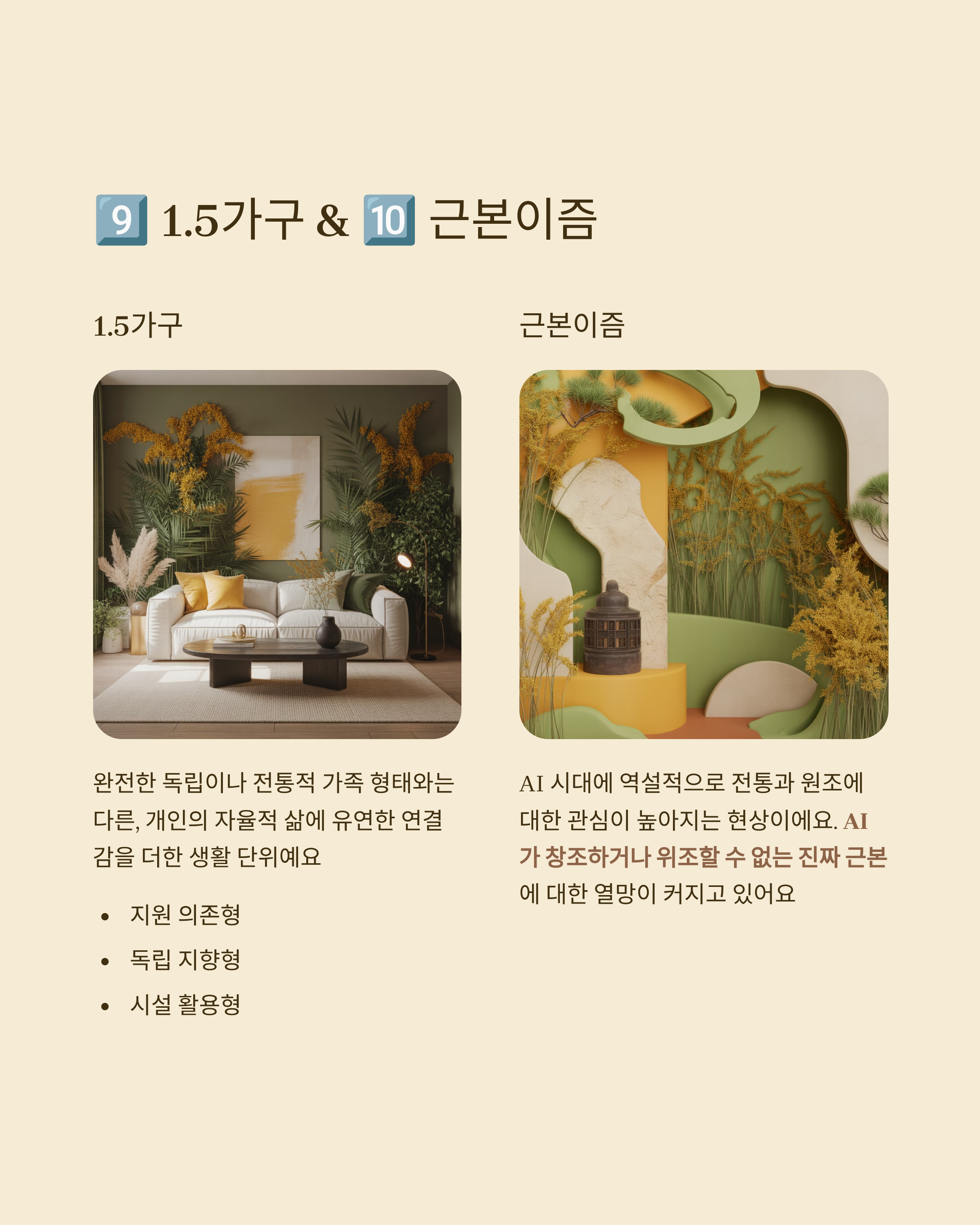 9. 1.5가구(1.5 Households) 완전한 독립이나 전통적 가족 형태와는 다른, 개인의 자율적 삶에 유연한 연결감을 더한 생활 단위입니다. 지원 의존형, 독립 지향형, 시설 활용형 세 가지 유형으로 나뉩니다.