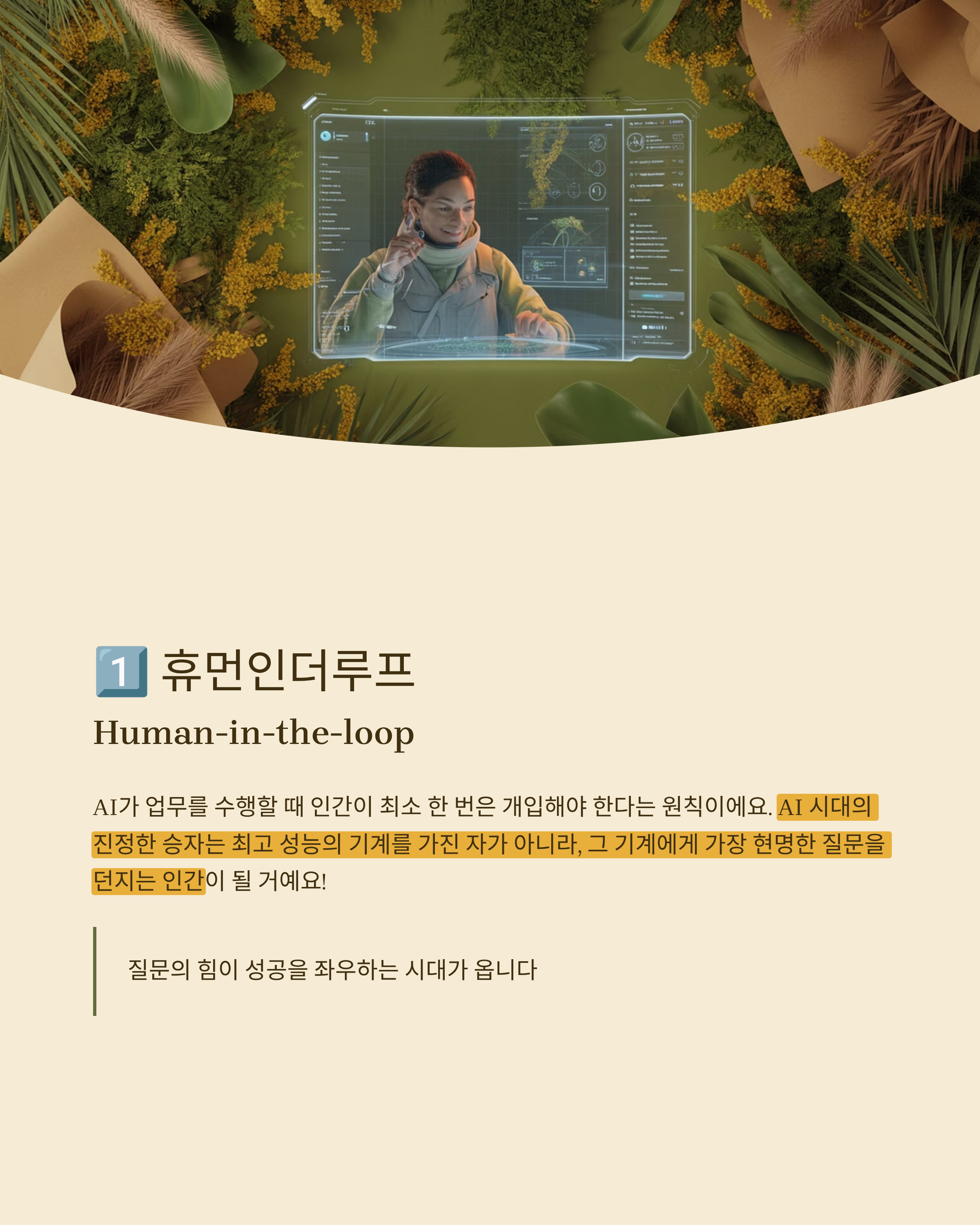 1. 휴먼인더루프(Human-in-the-loop) AI가 업무를 수행할 때 인간이 최소 한 번은 개입해야 한다는 원칙입니다. AI 시대의 진정한 승자는 최고 성능의 기계를 가진 자가 아니라, 그 기계에게 가장 현명한 질문을 던지는 인간이 될 것입니다.