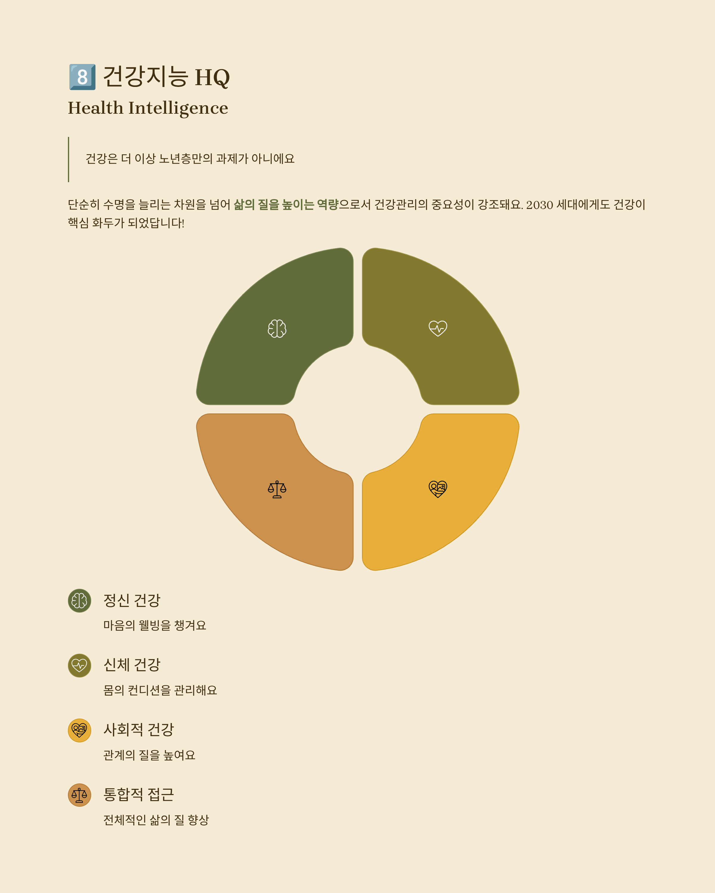 8. 건강지능 HQ(Health Intelligence) 단순히 수명을 늘리는 차원을 넘어 삶의 질을 높이는 역량으로서 건강관리의 중요성이 강조됩니다. 건강은 노년층만의 과제가 아니라 2030 세대에게도 핵심 화두가 되었습니다.