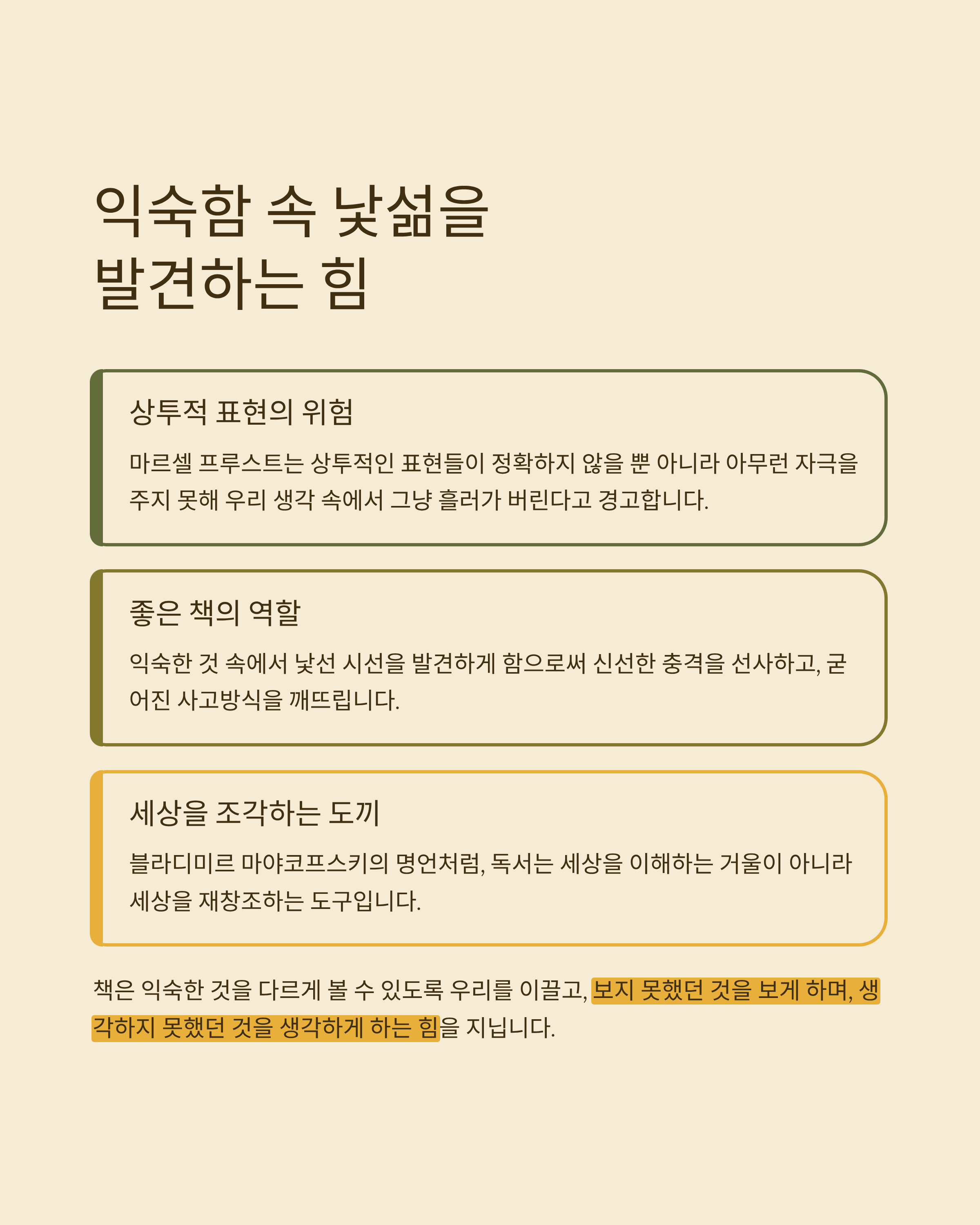 박웅현 작가님은 우리가 무심코 지나치는 상투적인 표현들이 얼마나 위험한지, 마르셀 프루스트의 말을 빌려 설명합니다. 상투적인 표현들은 정확하지 않을 뿐 아니라, 아무런 자극을 주지 못해 우리의 생각 속에서 흘러가 버린다고 합니다. 반면, 좋은 책은 익숙한 것 속에서 낯선 시선을 발견하게 함으로써 우리에게 신선한 충격을 선사하고, 굳어진 사고방식을 깨뜨리는 역할을 합니다 .
