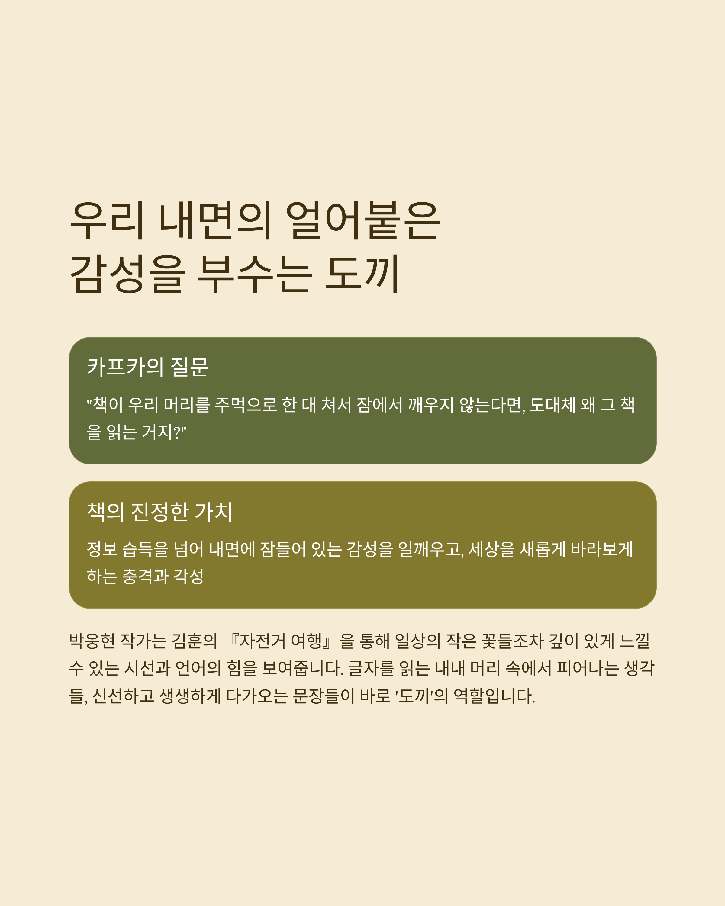 책은 과연 우리에게 어떤 의미일까요? 단순히 지식을 전달하고 시간을 채우는 도구일까요? 아니면 우리의 삶을 송두리째 뒤흔들고 새로운 시각을 열어주는 존재일까요? 『책은 도끼다』는 독서에 대한 우리의 오래된 관념을 깨부수는, 신선하고도 강력한 질문을 던집니다. 광고인이자 저자인 박웅현 작가님은 이 책을 통해 "우리가 읽는 책이 우리 머리를 주먹으로 한 대 쳐서 우리를 잠에서 깨우지 않는다면, 도대체 왜 우리가 그 책을 읽는 거지?"라는 프란츠 카프카의 말을 인용하며, 책이 우리에게 주어야 할 본질적인 충격과 각성을 강조합니다.