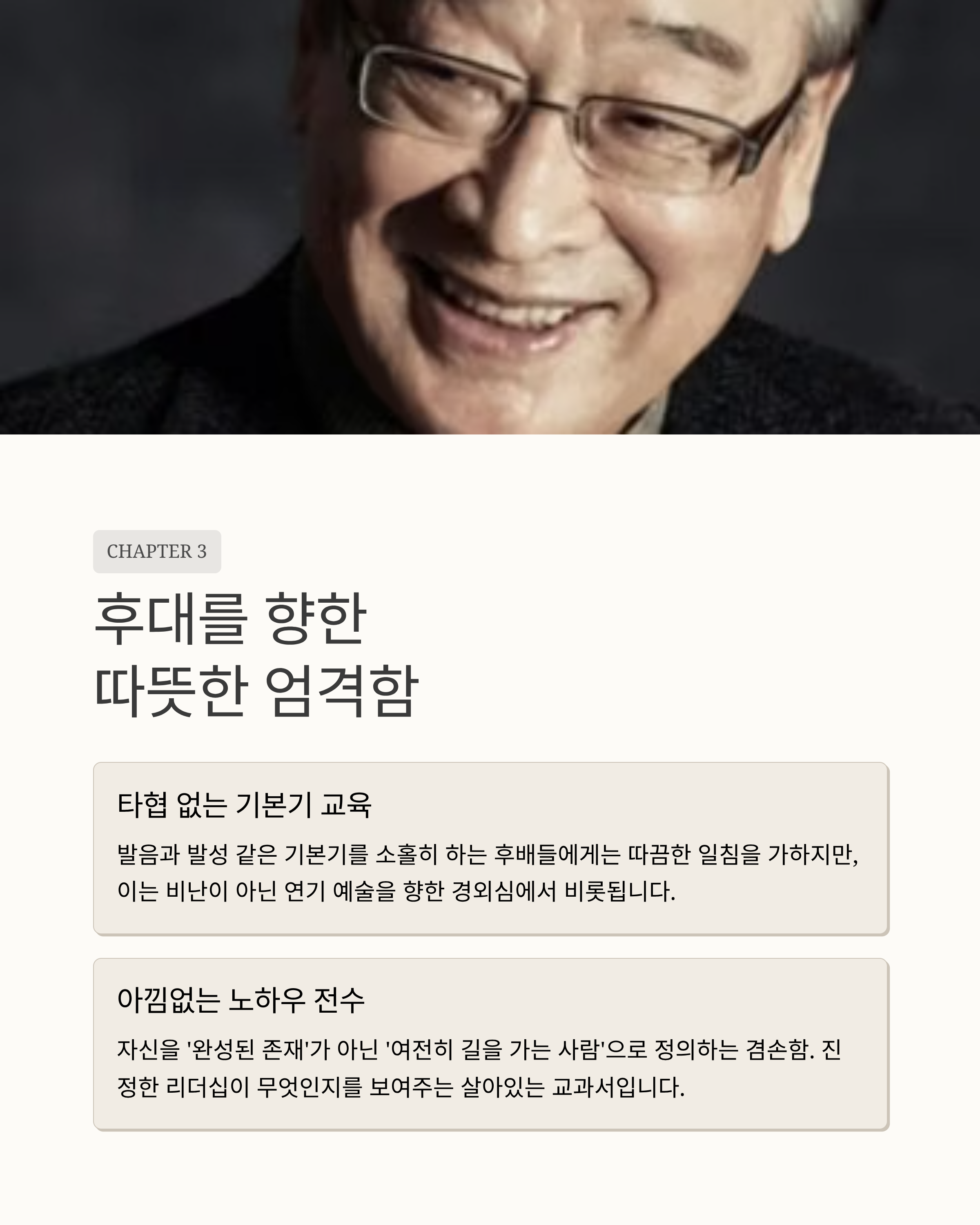 그는 '연기 지도'에 있어서는 타협이 없는 엄격한 스승입니다. 발음과 발성 같은 기본기를 소홀히 하는 후배들에게는 따끔한 일침을 가하지만, 이는 결코 비난이 아닌 연기라는 예술을 향한 숭고한 경외심에서 비롯된 것입니다.