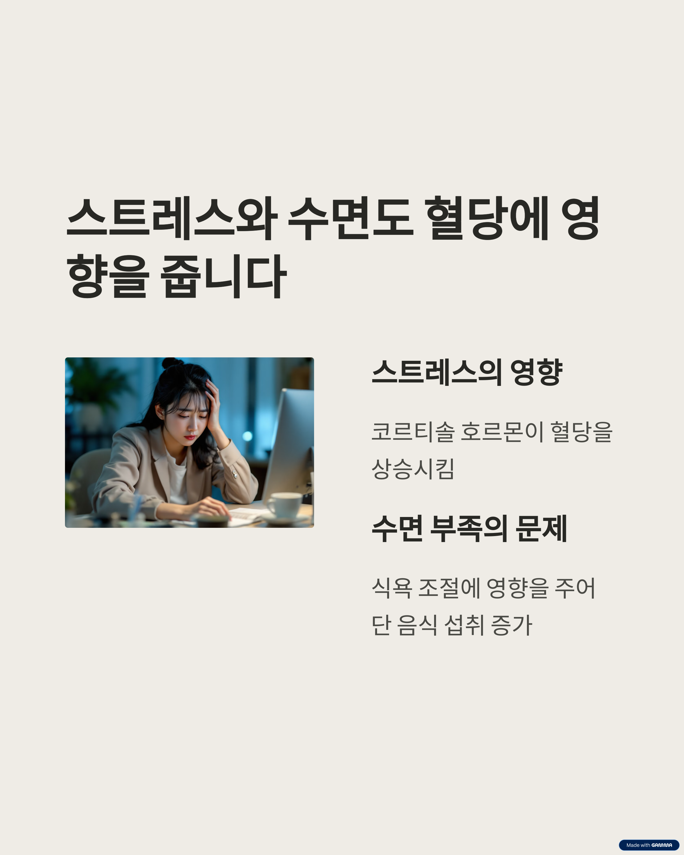 스트레스 호르몬인 코르티솔은 혈당을 상승시킬 수 있고, 수면 부족은 식욕 조절에 영향을 주어 단 음식 섭취를 늘릴 수 있습니다. 결국 잘 자는 것도 혈당 조절에 매우 중요합니다.